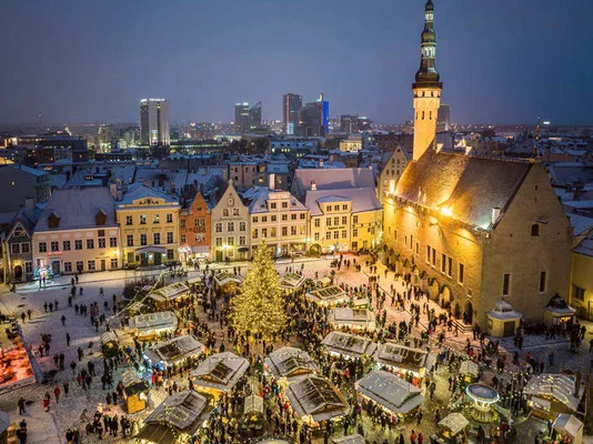 O mercado de Natal de Tallinn, na Praça da Prefeitura, é conhecido por seu cenário de conto de fadas, com neve cobrindo as casinhas de madeira. Os visitantes podem provar pratos típicos estonianos, como o porco assado e salsichas, além de ver o tradicional Papai Noel estoniano.