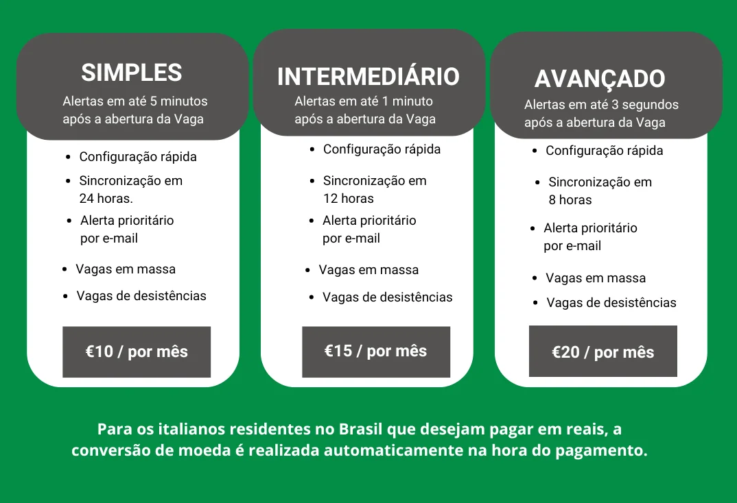 • Plano Básico (€10/mês): Alertas em até 5 minutos após a abertura de vagas.