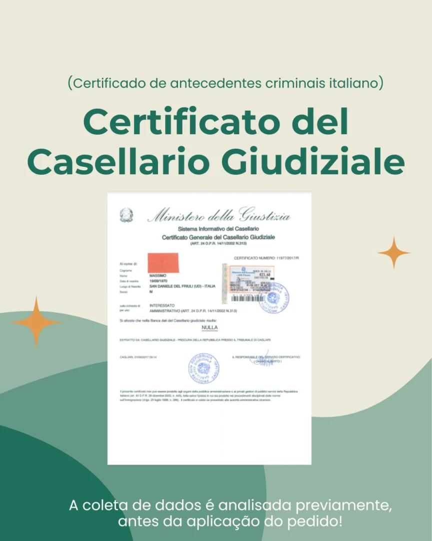 O Certificato del Casellario Giudiziale é um documento oficial emitido pelo Ministério da Justiça da Itália que reúne informações sobre a situação penal, civil e administrativa de uma pessoa no território italiano.
